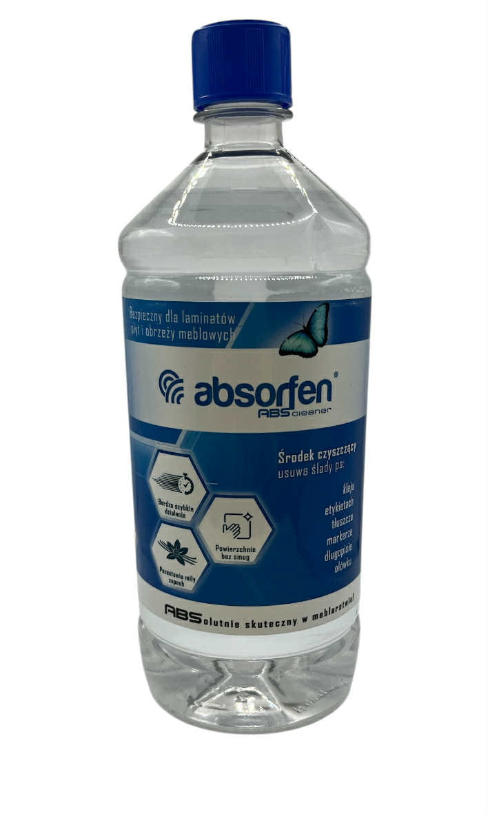 Absorfen Normal - środek czyszczący z antystatykiem nie rozpuszczający tworzywa stosowany do czyszczenia powierzchni płyt meblowych zakończonych obrzeżem meblowym ABS, usuwania resztek kleju zostawionych podczas oklejania płyt meblowych, czyszczenia twardych płyt kompaktowych PVC.